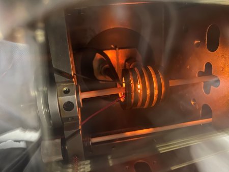 The quenching mode is the most commonly used in this system where we have the capability of heating samples up at ~1000°C/s and obtaining quench rates ~400°C/s (sample dependent). Using an induction coil to provide accurate heating to samples under vacuum or in an inert atmosphere (Argon, Helium or Nitrogen). Samples are usually 4mm diameter and 10mm in length, although alternative sample geometries can be utilised. This mode is often used to generate continuous-cooling-transformation (CCT) or isothermal time-temperature-transformation (TTT) diagrams.